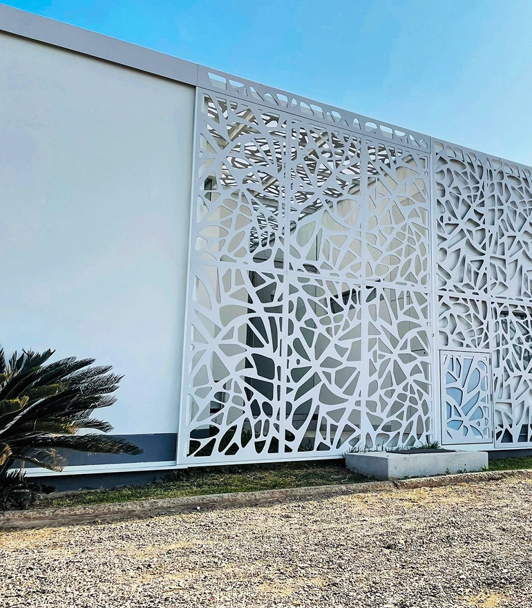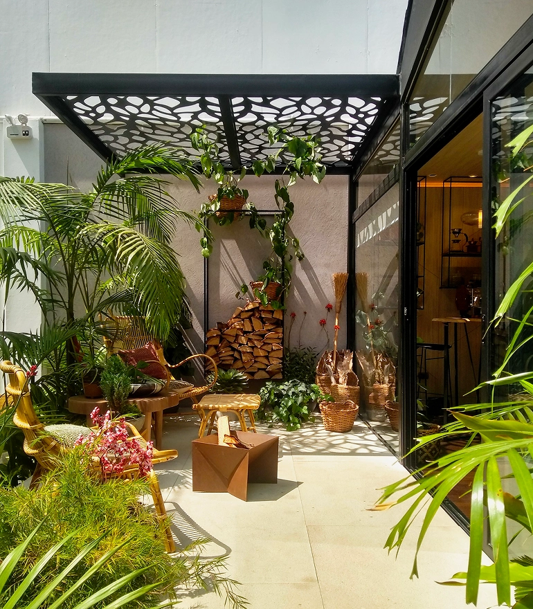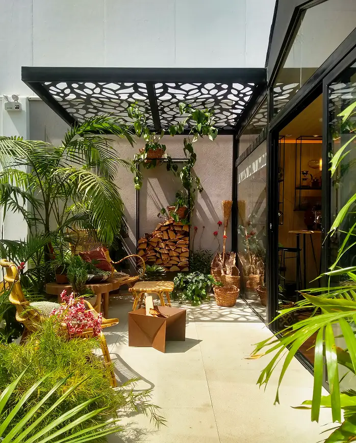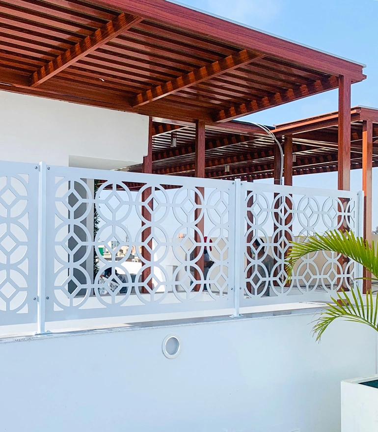 Celosías y estructuras integradas armónicamente en espacios residenciales y comerciales.